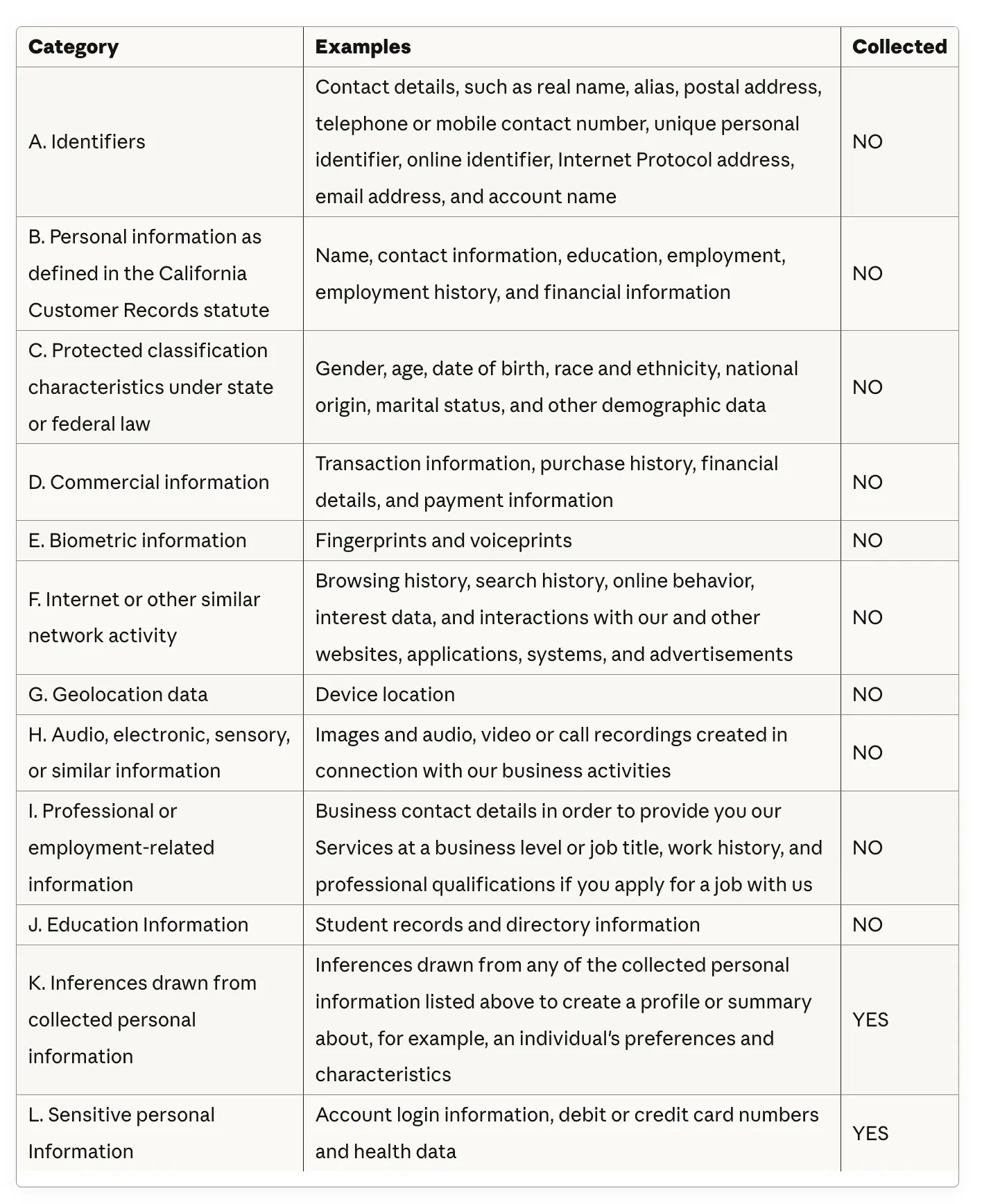 Categories of Personal Information We Collect